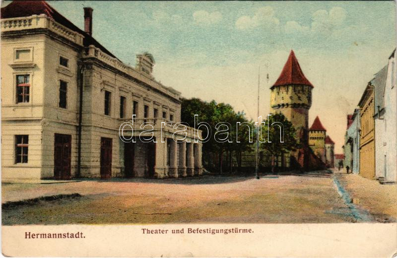 1907 Nagyszeben, Hermannstadt, Sibiu; Theater und Befestigungstürme. Verl. d. Buchh. G. A. Seraphin. Chromophot. von Jos Drotleff / színház, erődtornyok / theatre, towers (kis szakadás / small tear)