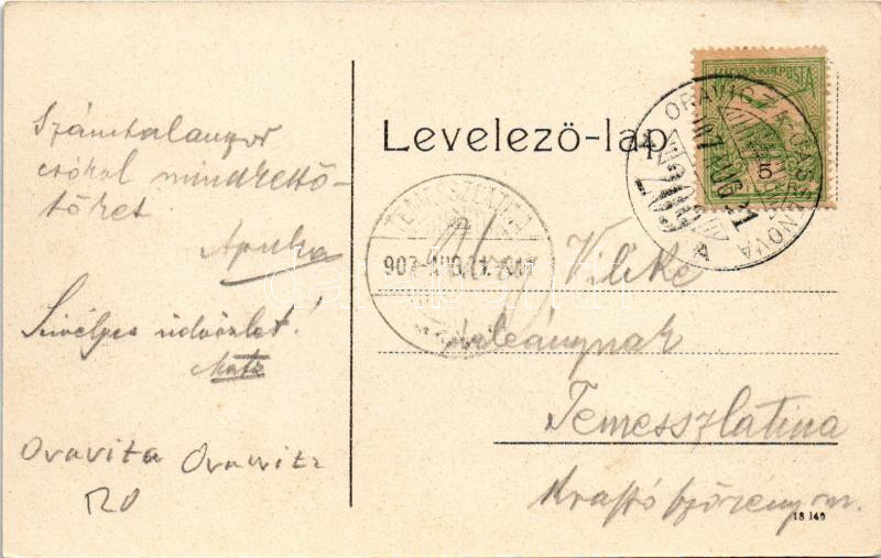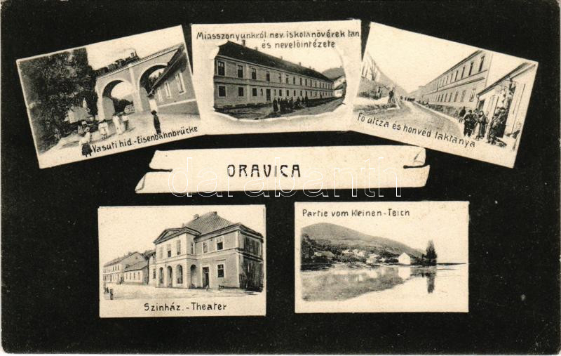 1907 Oravicabánya, Oravica, Oravita; vasúti híd, gőzmozdony, vonat, Miasszonyunkról nev. iskolanővérek tan- és nevelőintézete, Fő utca és honvéd laktanya, Színház, Kistó részlet / railway bridge with locomotive, train, boarding school, main street and K.u.k. military barracks, theatre, lake + "ORAVICZA - JASSENOVA 209 A" vasúti mozgóposta bélyegző (EK)