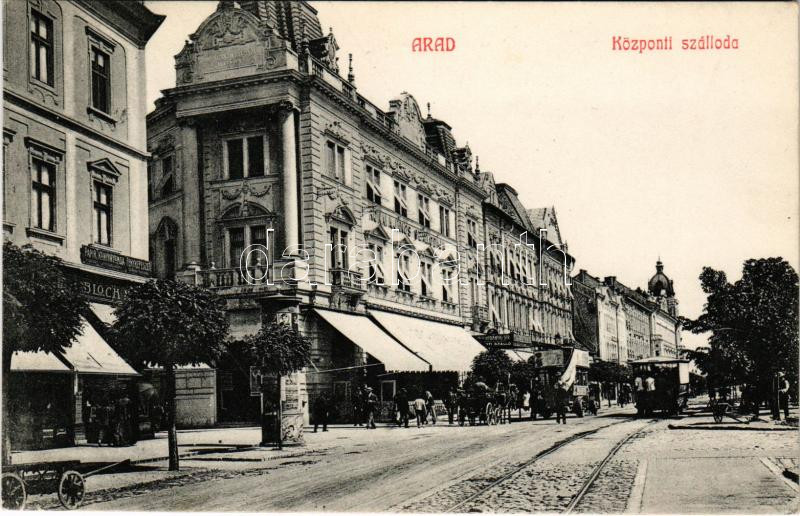 1910 Arad, Központi szálloda, emeletes autóbusz, Központi szálloda, lóvasút, Bloch H. nyomdája, üzletek. Kerpel Izsó kiadása / hotel, double-decker autobus, hotel, horse-drawn tram, publishing house, shops (EK)