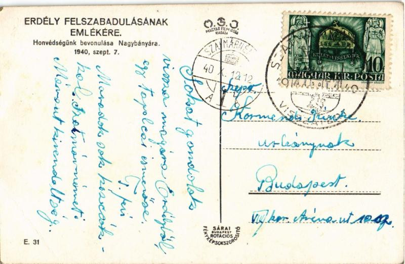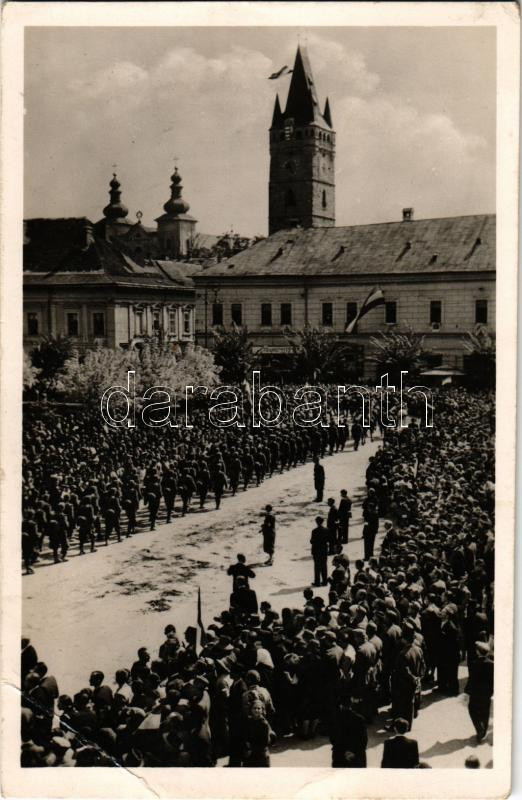 1940 Nagybánya, Baia Mare; Honvédségünk bevonulása, Frankovits üzlete / entry of the Hungarian troops, shop + "1940 Szatmárnémeti visszatért" So. Stpl. (EB)