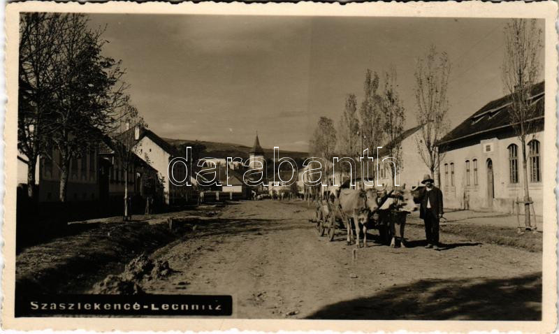 1940 Szászlekence, Lekence, Lechnita; utca, templom, ökrös szekér / street view, church, ox cart. photo