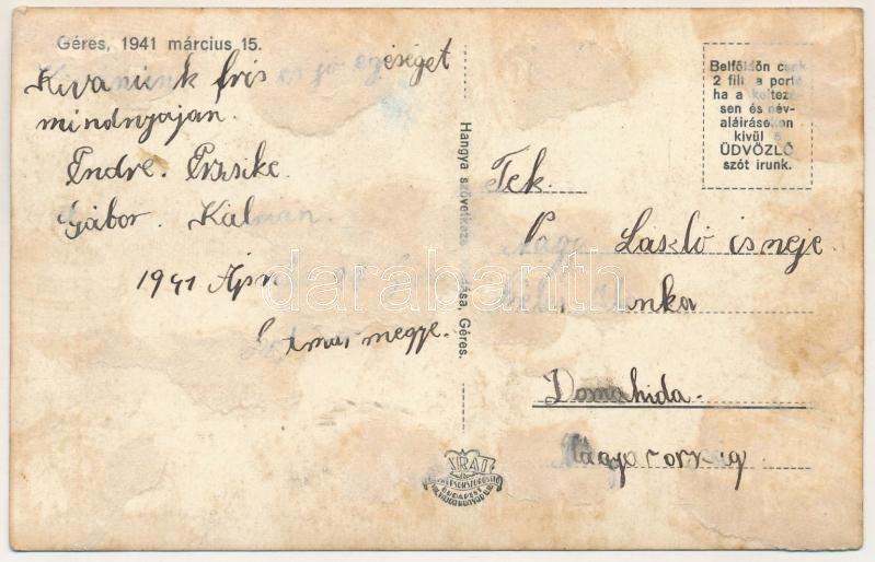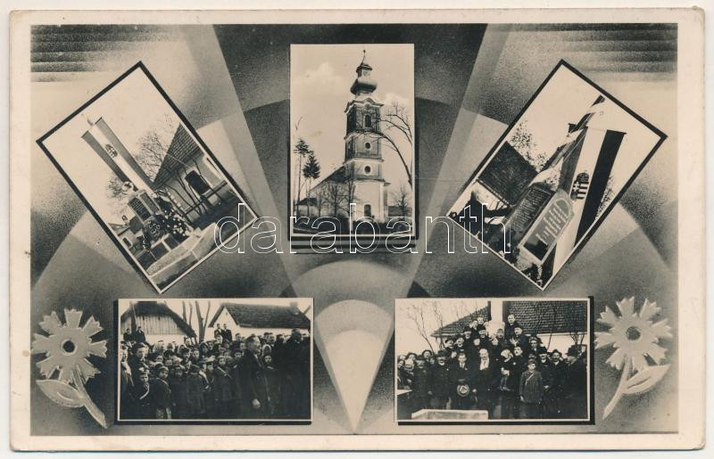 1941 Géres, Ghirisa; templom, szövetkezeti üzlet, megkoszorúzott országzászló, március 15-ei ünnepség. Hangya kiadása / church, cooperative shop, wreathed Hungarian flag and monument (ragasztónyomok / glue marks)