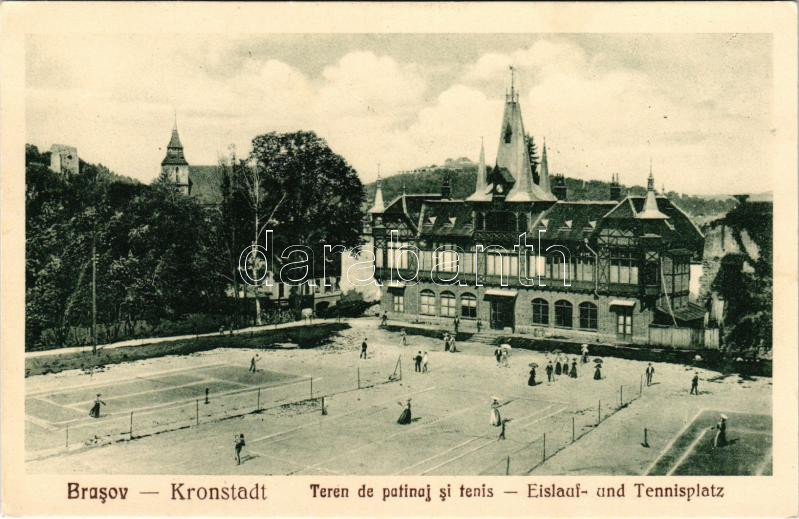 Brassó, Kronstadt, Brasov; Teren de patinaj si tenis / Korcsolyapálya és teniszpálya teniszezőkkel. W. Hiemesch kiadása / Eislauf- und Tennisplatz / skating rink and tennis courts with tennis players