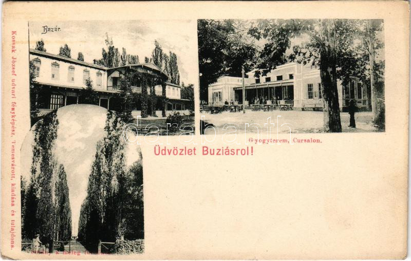 Buziásfürdő, Baile Buzias; Bazár, Gyógyterem, sétány a melegfürdőhöz. Kossak József udvari fényképész kiadása / spa, bazaar, baths (EK)