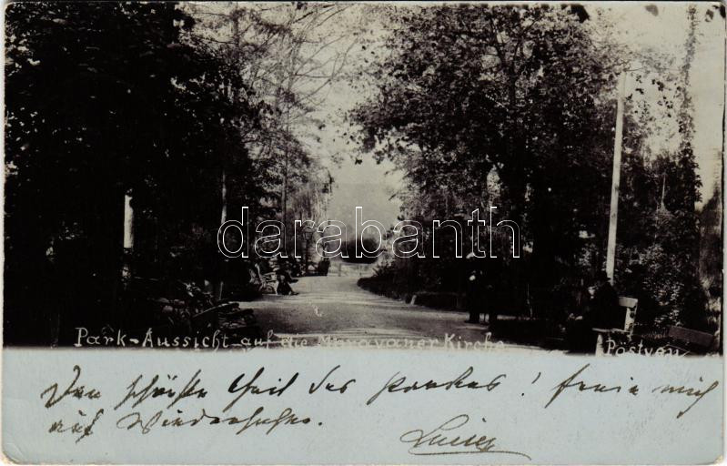 1901 Pöstyén, Piestany; Park-Aussicht auf die Moravaner Kirche / park részlet / park. photo (EK)