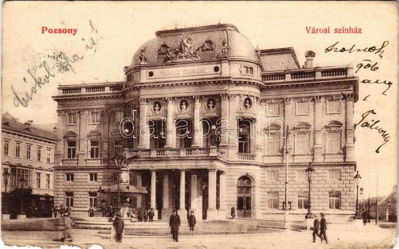 1906 Pozsony, Pressburg, Bratislava; Városi színház. Hátoldalon sorsjegy a Klotild királyi főhercegnő Ő Fensége védnöksége alatt álló "Fehér Kereszt" délvidéki gyermekvédő egyesület Szegény gyermekpoliklinikája javára / theatre, lottery ticket on the backside (b)