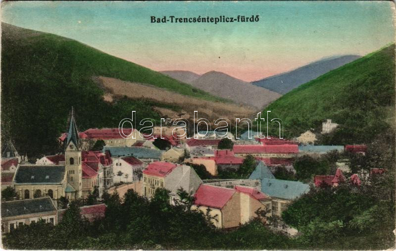 1915 Trencsénteplic, Trencianske Teplice; látkép, templom / general view, church (ázott / wet damage)