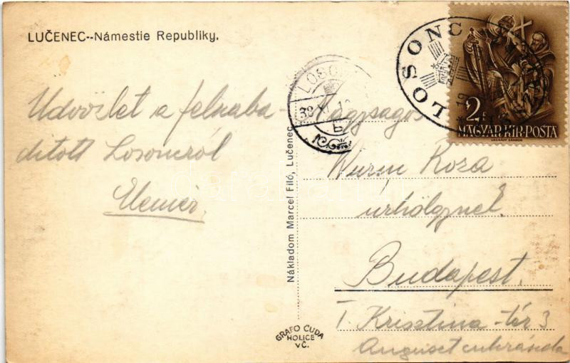 1938 Losonc, Lucenec; Köztársaság tér, templom, Tarjányi János és Ignatz Redlinger üzlete. Marcel Filó / Námestie Republiky / square, church, shops + "1938 Losonc visszatért" So. Stpl.