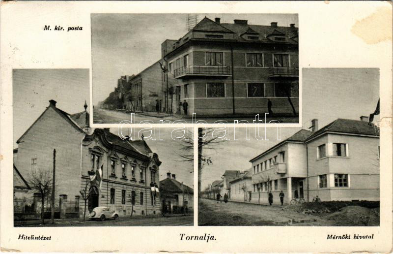 1940 Tornalja, Tornala; M. kir. posta, Hitelintézet, magyar zászló, automobil, Mérnöki hivatal, kerékpár. Poraczky László kiadása, Bussányi foto felvétele / post office, loan bank, Hungarian flag, automobile, engineering office, bicycle (fl)