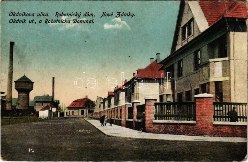 Érsekújvár, Nové Zámky; Okánikova ulica, Robotnicky dom / Okánik utca, Munkásotthon, víztorony / street view, workers' home, water tower (fa)