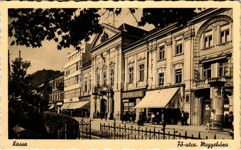 Kassa, Kosice; Fő utca, Megyeháza, Freudenfeld Oszkár hentes üzlete / main street, county hall, butcher shop
