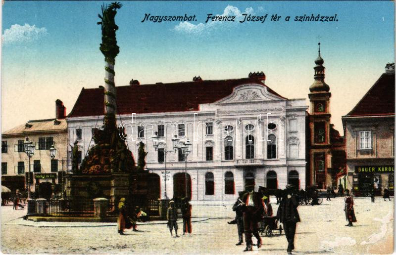 Nagyszombat, Tyrnau, Trnava; Ferenc József tér a színházzal, Smekel és fia, Magran Miksa és fia, Bauer Károly üzlete / square, theatre, shops (r)