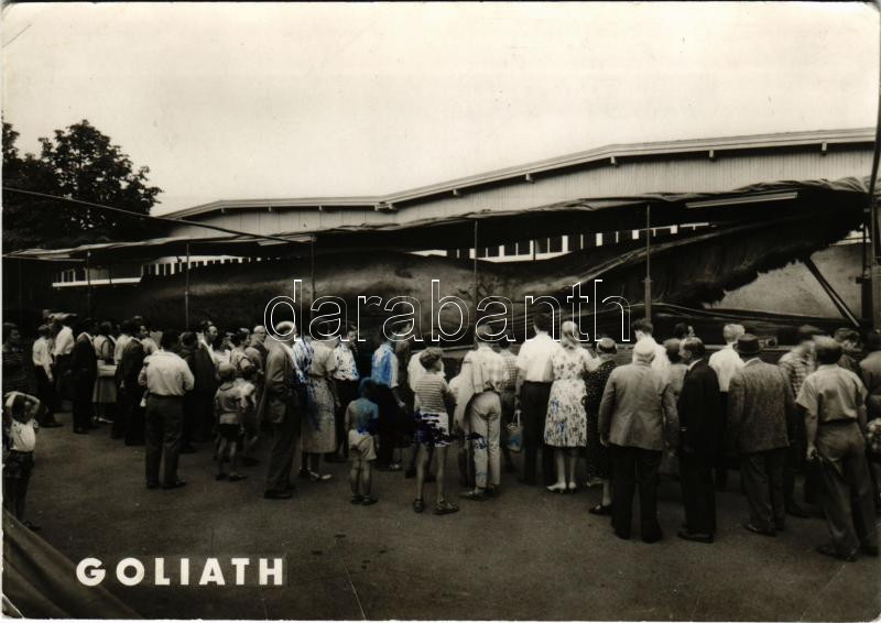 ben norvég partoknál kifogott, majd preparált 22 méteres, 68 tonnás kékbálna volt, amely 1961-1963 között járta Európát, és kétszer Magyarországon is hatalmas tömegeket vonzott / Goliath. Giant whale, 68,000 kg. Caught in 1954 in Trondheim, Norway (EB)