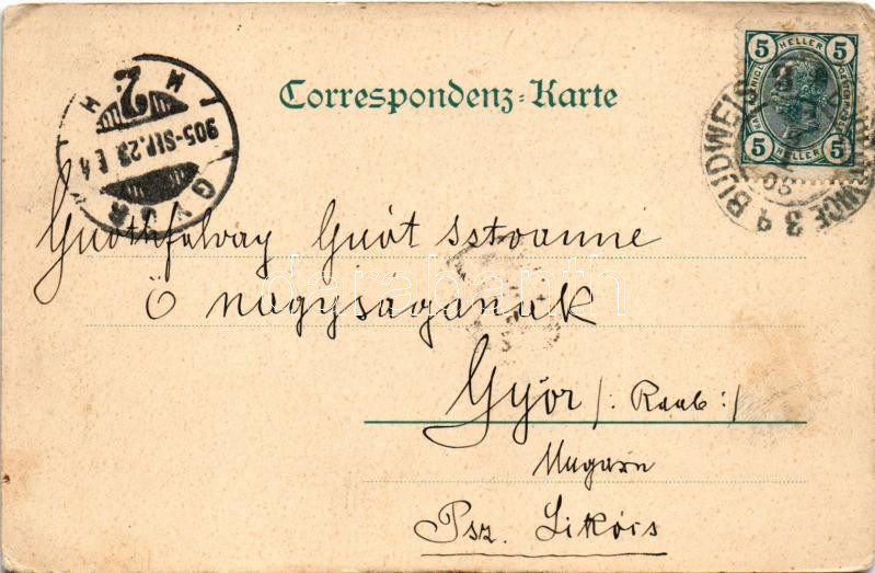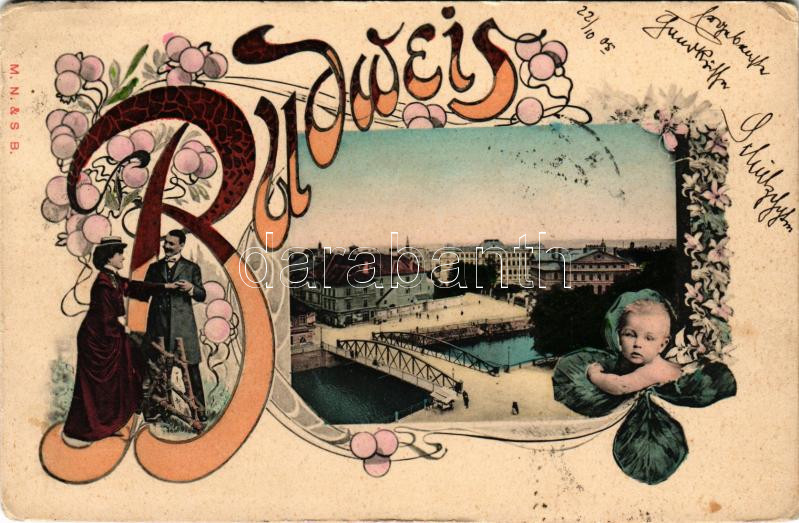 1905 Ceské Budejovice, Budweis; view, montage with love couple and baby. Art Nouveau, floral (EK)