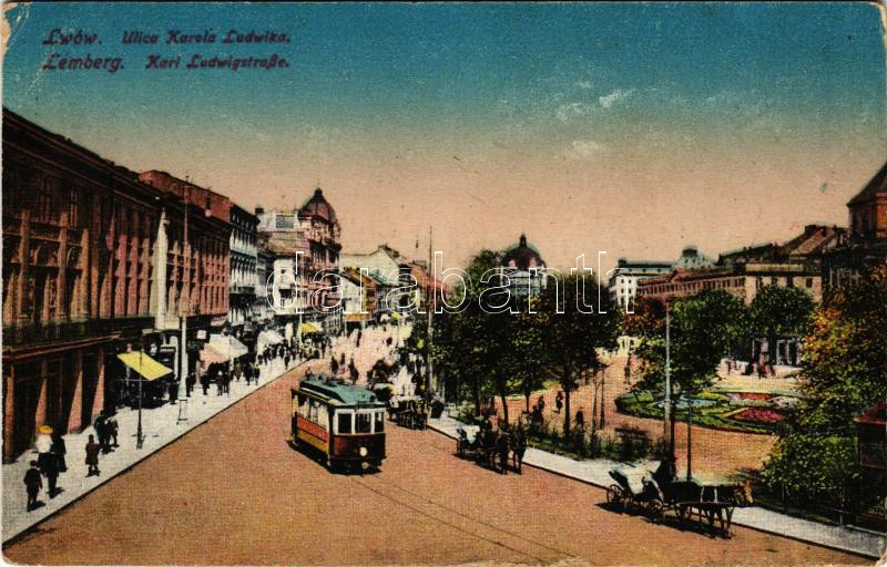 1916 Lviv, Lwów, Lemberg; Ul. Karola / street view, tram + "K.u.k. Etappenpostamt 185" (EK)