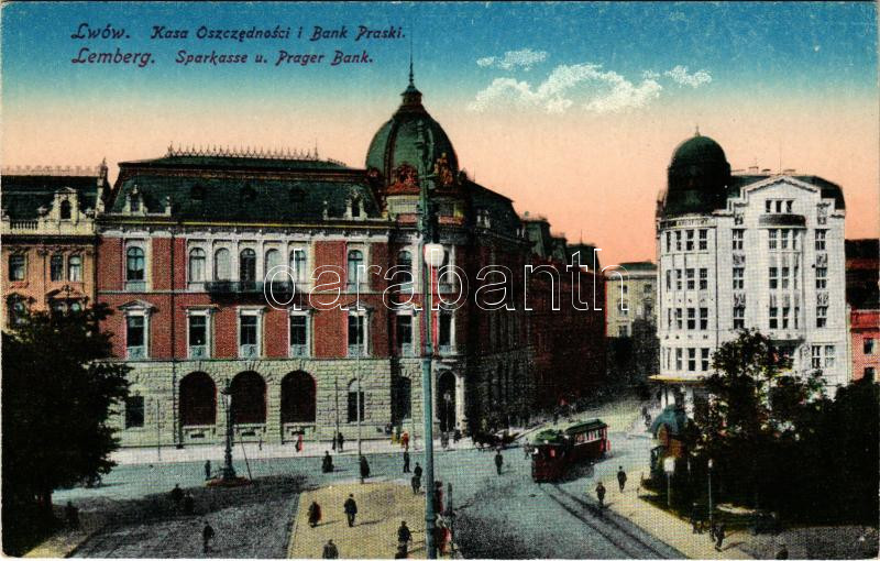 Lviv, Lwów, Lemberg; Sparkasse u. Prager Bank / Kasa Oszczednosci i Bank Praski / savings bank, tram
