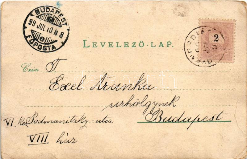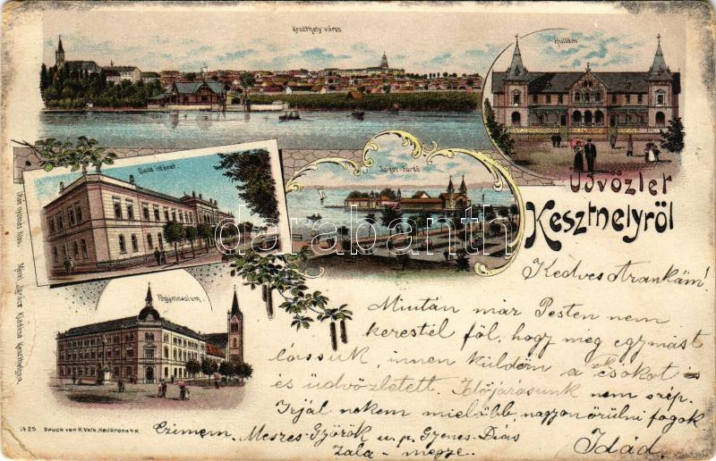 1899 Keszthely, látkép, Gazdasági Intézet, Sziget fürdő, Hullám szálloda, Főgimnázium. Mérei Ignác kiadása. Art Nouveau, floral, litho (kopott sarkak / worn corners)
