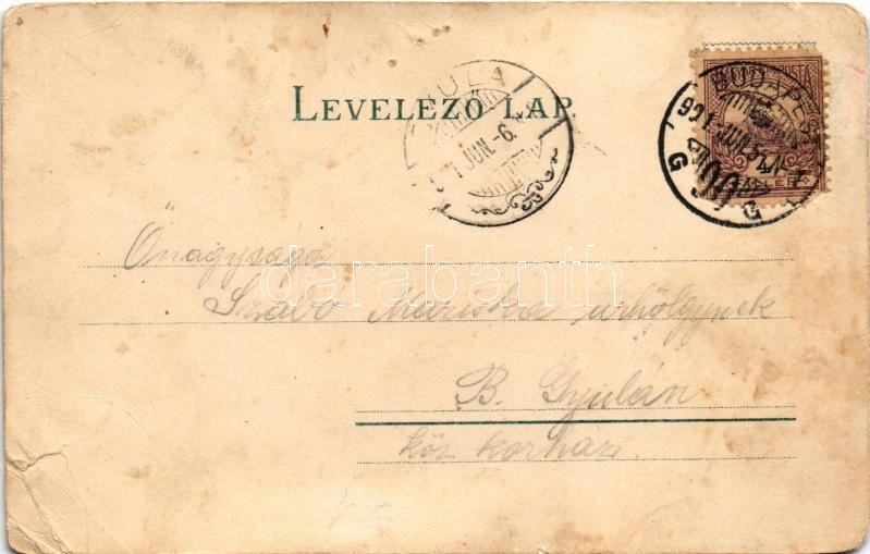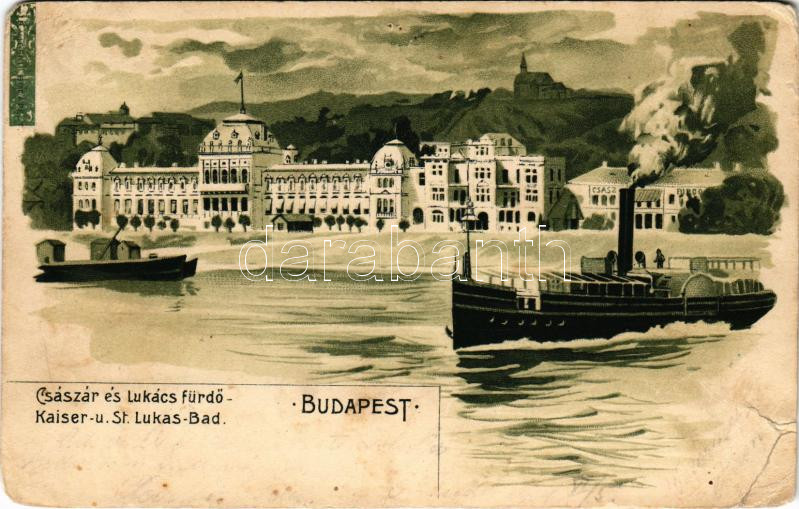 1901 Budapest II. Császár és Szent Lukács fürdő, gőzhajó a Dunán. Art Nouveau, litho (b)