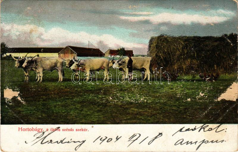 1904 Hortobágy, hat ökrös szénás szekér, magyar folklór. D.T.C.L. Ser. 271. 16. + "KOLOZSVÁR - BUDAPEST 298. SZ." vasúti mozgóposta bélyegző (felületi sérülés / surface damage)