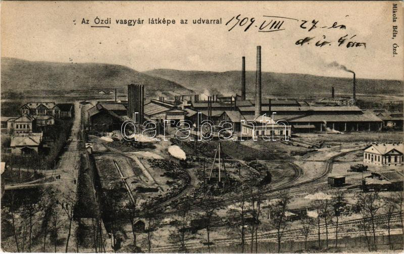 1909 Ózd, vasgyár látképe az udvarral, iparvasút. Mikola Béla kiadása (fl)