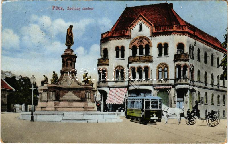 1914 Pécs, Zsolnay szobor, villamos, hintó. Karpf Berta kiadása (EM)