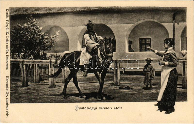 Hortobágy, csárda előtt, magyar folklór. Kiadja Telegdi K. Lajos utóda, Haranghy Gy. felvétele