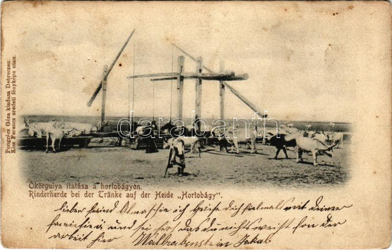 Hortobágy, ökörgulya itatása; kiadja Pongrácz Géza, Kiss Ferencz eredeti fényképe után (tűnyomok / pinmarks)