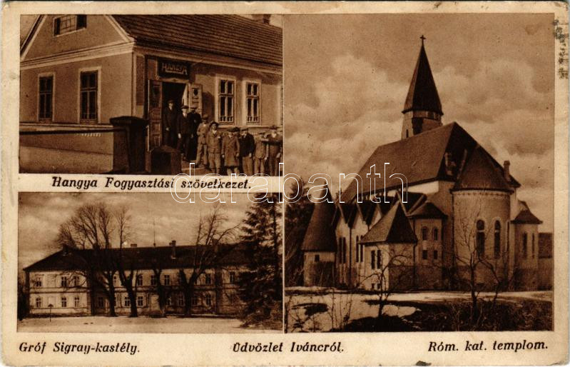 Ivánc, Római katolikus templom, Gróf Sigray kastély, Hangya Fogyasztási Szövetkezet üzlete. Szilágyi Arthur műterméből (Rb)