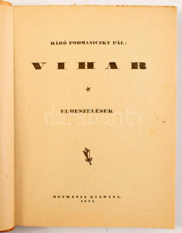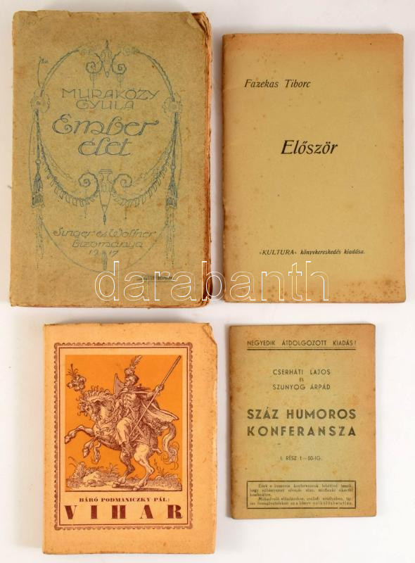 4 db könyv: Báró Podmaniczky Pál: Vihar. Elbeszélések. Bp., 1924, Bethánia. Kiadói papírkötés. + Muraközy Gyula: Emberélet. Bp., 1917, Singer és Wolfner. Kiadói papírkötés. + Cserháti Lajos és Szunyog Árpád száz humoros konferansza. I. rész. Bp., é.n., Kókai Lajos. Kiadói tűzött papírkötés. + Fazekas Tiborc: Először. Kecskemét, 1947, Kultura. Kiadói tűzött papírkötés. Vegyes állapotban.
