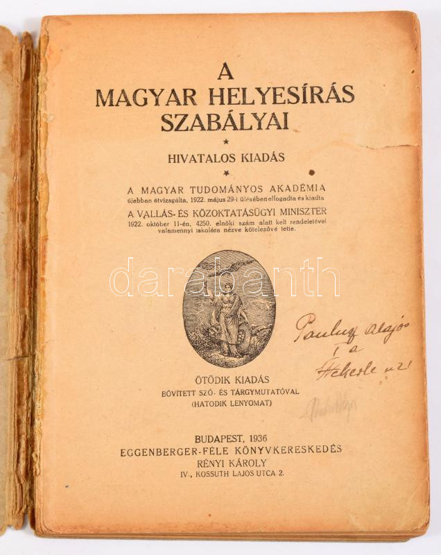 A magyar helyesírás szabályai. Hivatalos kiadás. Ötödik kiadás. Bp., 1936, Eggenberger-féle Könyvkereskedés. 114p. Paulus Alajos (1925-2011) Balázs Béla-díjas (2000) magyar filmrendező, forgatókönyvíró, 1956-os elítélt névbejegyzésével. Kiadói papírkötés, sérült gerinc, kopottas állapotban.