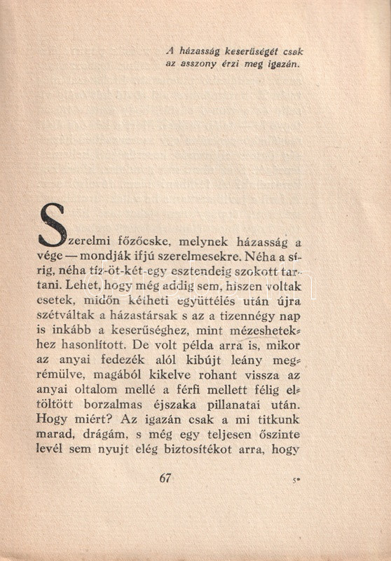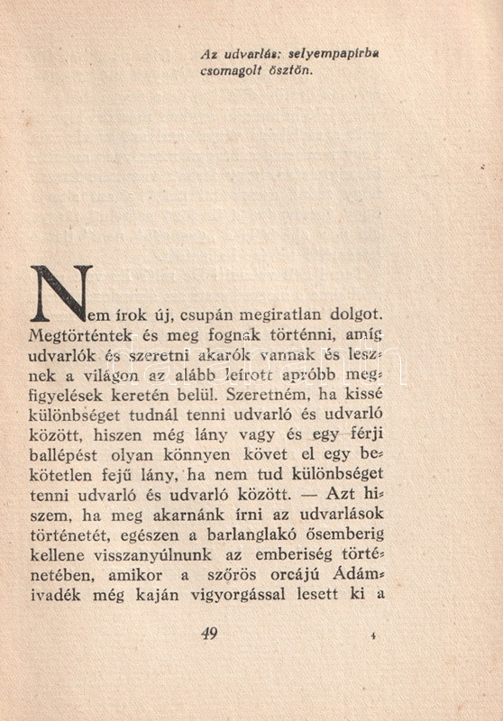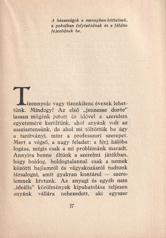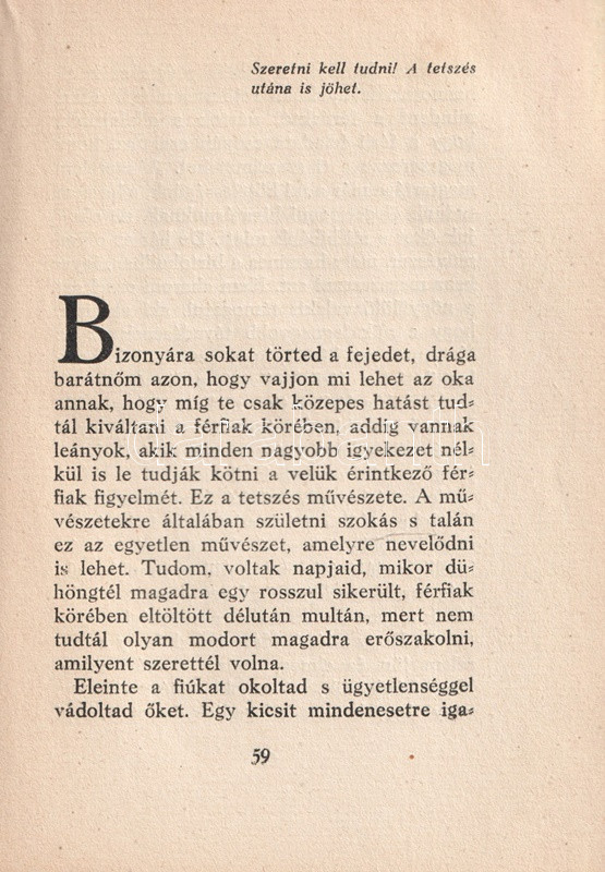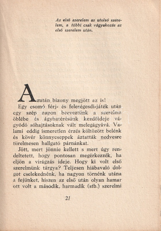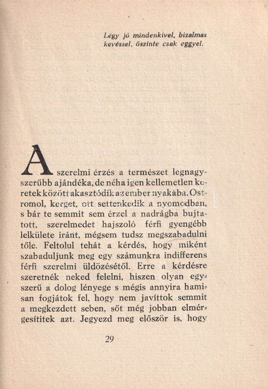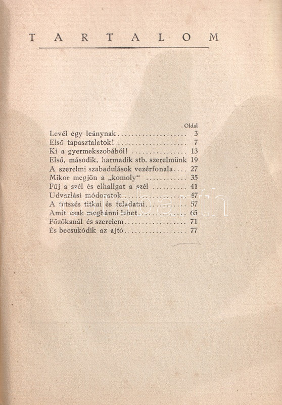 Anonim szerzőtől származó szerelmi tanácsadó kötetünk az 1920-as évek középosztálybeli hajadonjai számára készült, akik fiatalságukban több gavallér udvarlását elfogadták ugyan, ám valójában a valamirevaló férj számára tartogatják magukat. Tanácsadó kötetünk ügyesen kerüli a testiség részleteit; a modern, polgári hajadon számára a megfelelő utat az ártalmatlan flörtök megfelelő kezelésében jelöli ki, végcélként pedig a jövendőbeli melletti kitartást javasolja, az elhamarkodott házasságtól pedig óva int. Nőtörténeti dokumentumként jellemezhető kötetünk Masierevich György által illusztrált, finoman erotikus, art deco borítója kissé ellentmond a tartalomnak.