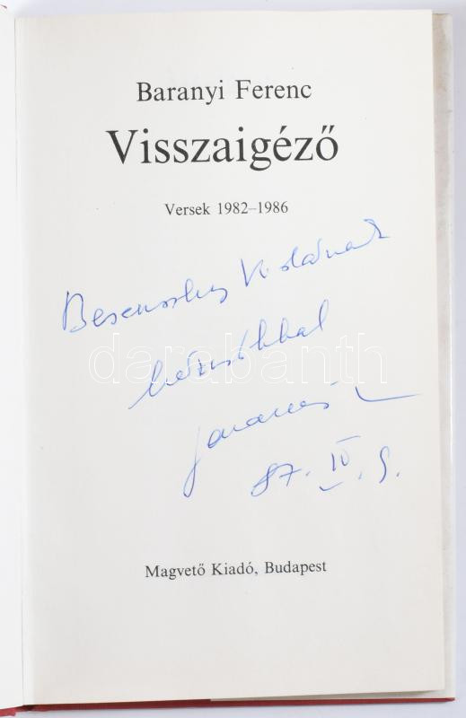 Baranyi Ferenc: Visszaigéző. Dedikált! Magvető Könyvkiadó, 1987. Egészvászon kötésben, papír védőborítóval.