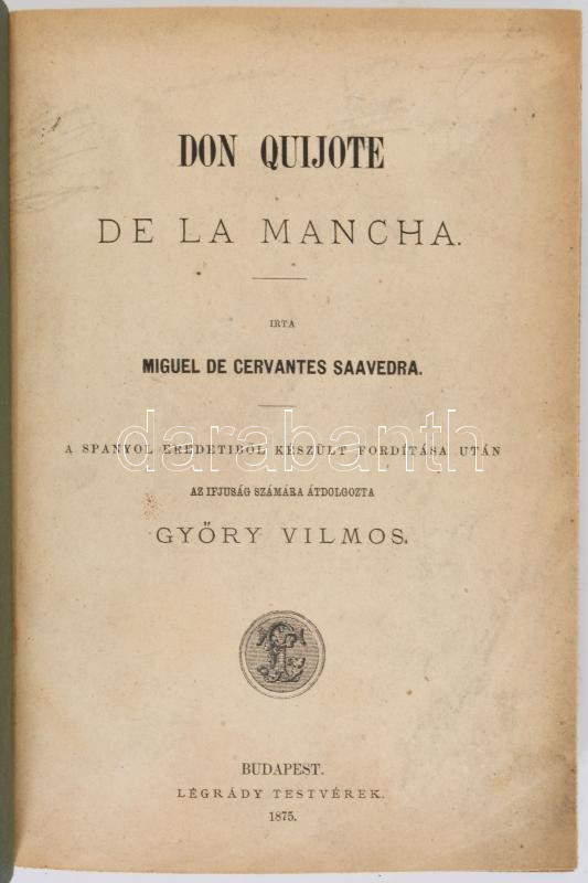 Cervantes Saavedra, Miguel de: Don Quijote de la Mancha. A spanyol eredetiből készült fordítása után az ifjuság számára átdolgozta: Győry Vilmos. Bp., 1875, Légrády, [4]+407+[1] p. Átkötött félvászon-kötésben, nagyrészt jó állapotban, néhány kissé foltos lappal.