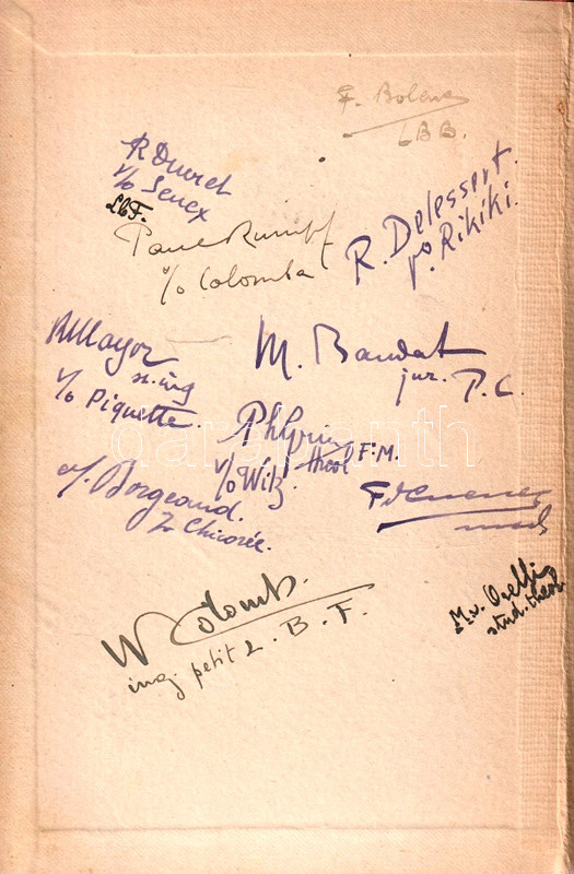 Az első előzéken a testvériség néhány aktuális tagjának saját kezű aláírásával, az aláírás mellett a testvériségen belüli szekció (Rikiki, Piquette, Seuex) feltüntetésével. Az első előzéken tulajdonosi bejegyzés (Pierre Aartina teológus hallgató), valamint a Zofingeni Testvériség néhány tagjának aláírása: R. Duiret (Duivel), F. Bolena, Paul Runolf, R. Desselert, Bulayor, M. Baudat, Phlyvin, Borgeaud és M. Orelli.