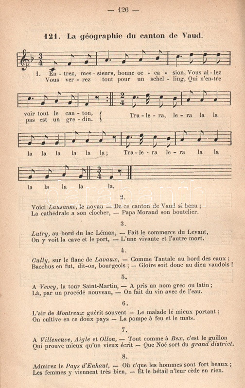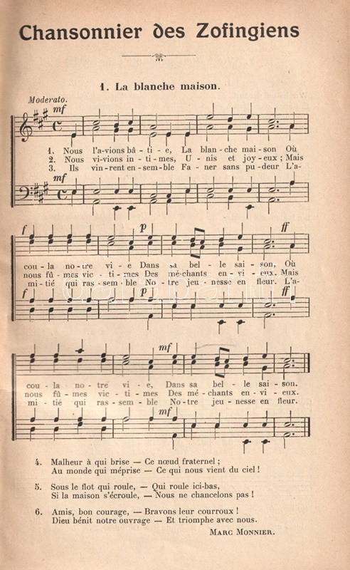 A napóleoni idők megszállt német területein számos helyen alakultak diákszövetségek, melyek egyszerre képviseltek hazafias és politikai gondolatokat, közösségi kötődést az adott iskolához, illetve idővel generációkon átívelő érdekképviseletet. A német diáktestvériségek mintájára az 1810-es évektől Közép-Európa-szerte alakultak hasonló hazafias diákszervezetek, így Svájcban is, ahol 1819-ben alakult meg a Zofingeni Diáktestvériség. Egyetlen országon belül természetesen bőségesen virágoztak különféle diáktestvériségek, melyek között akár éles rivalizálás is folyt, amely akár tettlegességig is fokozódott. A Zofingeni Diáktestvériség, a legrégebbi svájci Bruderschaft (jóllehet hazafiasságában és konzervatív mivoltában osztozott a legtöbb diákegylettel) maga nem tartozik a kimondottan elitista, kimondottan bezárkózó és harcias szellemű testvériségek közé, tevékenysége a svájci mivolt, a svájci és diákhagyományok magasztalásában merült ki. Miként kottákkal gazdagon kísért énekeskönyvünkből kiderül, a diáktestvériségnek különösen nagy muzikális hagyományai vannak, gyűléseiken, közösségi alkalmaikon Svájc szabadságának, egységének és havasi hagyományainak fontosságát megjelenítő dalok hangzottak el. Daloskönyvünk énekeinek túlnyomó része francia nyelvű, egy része annak ellenére katolikus szellemet tükröz, hogy a Zofingeni Testvériség elviekben szigorú felekezeti kötődést nem ismer. A francia anyagon kívül kötetünk második részében néhány svájci német dal is található. A Zofingeni Daloskönyv első kiadása 1866-ban jelent meg, példányunk a mű új, bővített, 1910. évi kiadásából való.