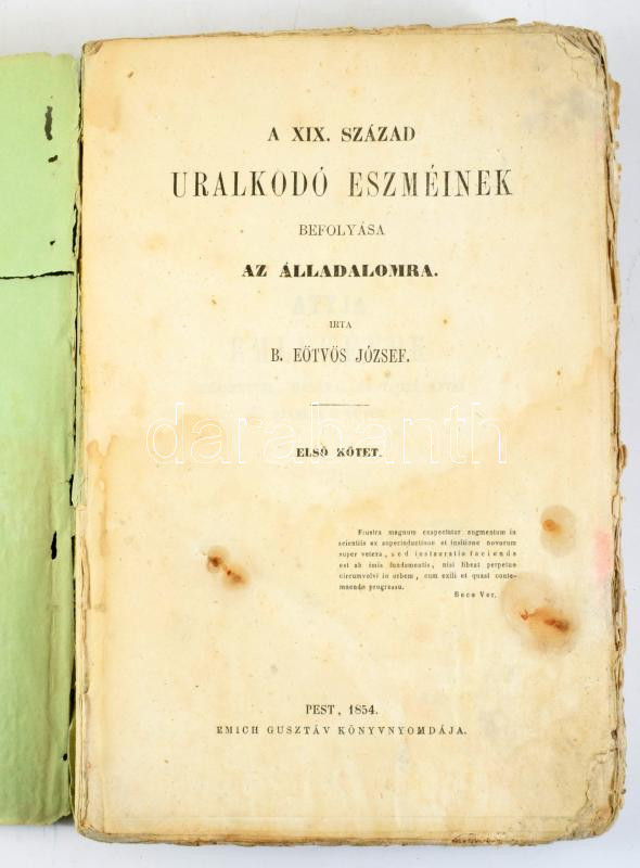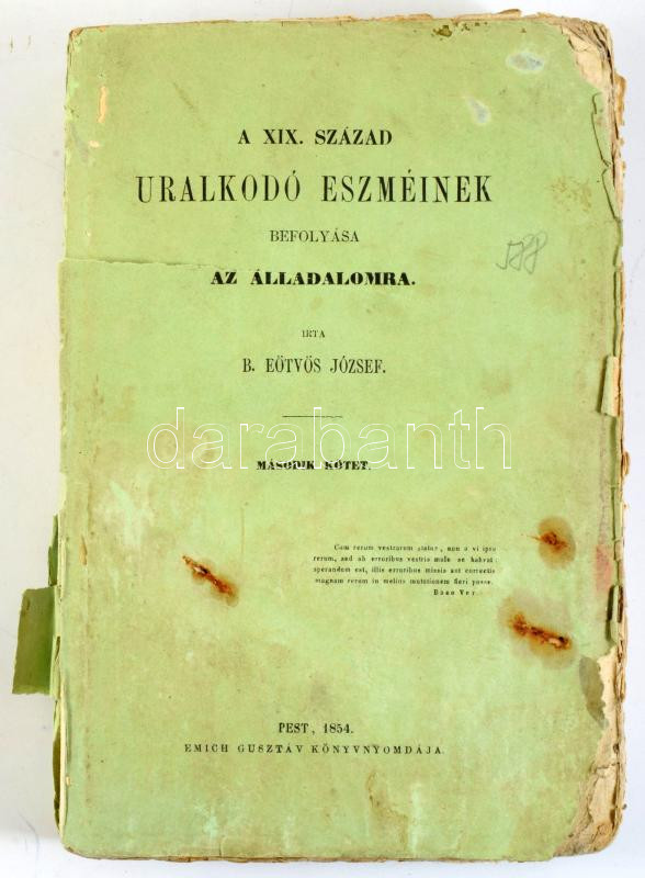 Eötvös József: A XIX. század uralkodó eszméinek befolyás az álladalomra. II. kötet. Írta: B. - -. Pest, 1854, Emich Gusztáv, 10+587 p. A II. kötet 1. kiadása, az I. kötet 1. kiadása 1851-ben jelent meg. Kiadói papírkötés, sérült borítóval, foltos, penészes lapokkal. Rossz állapotban.