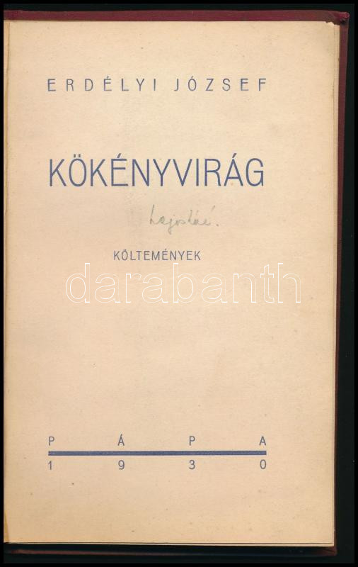 Erdélyi József: Kökényvirág. Költemények. Pápa, 1930, szerző (Főiskolai-ny.), 29+[3] p. Egyetlen kiadás. Átkötött egészvászon-kötésben, kissé viseltes borítóval, az eredeti elülső papírborítót bekötötték.
