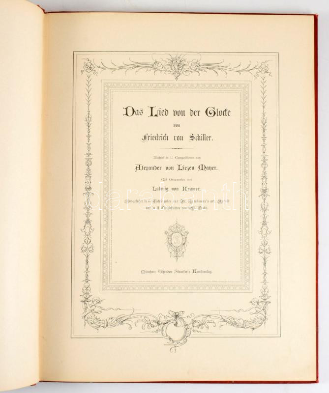 Friedrich von Schiller: Das Lied von der Glocke; von - -. Illustriert in 17 Compositionen von Alexander von Liezen Mayer. Mit Ornamenten von Ludwig van Kramer. München, én., Theodor Stroefer's Kunstverlag, 18 sztl. lev. +6 t. Német nyelven. Gazdag fekete-fehér képanyaggal, és egészoldalas táblákkal illusztrált. Kiadói illusztrált egészvászon-kötés, aranyozott lapélekkel, kopott borítóval, a gerincen kis sérüléssel.