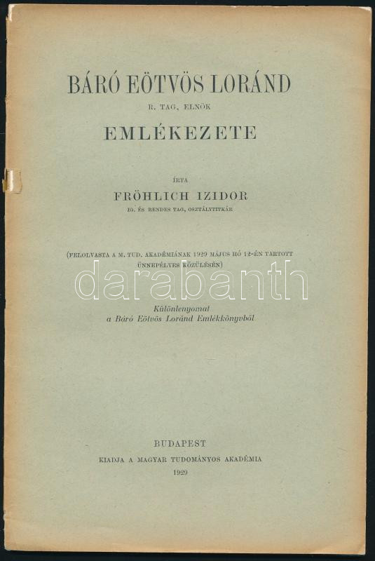 Frölich Izidor: Báró Eötvös Loránd emlékezete. Bp., 1929. MTA. 64p. Fűzve, kiadói papírborítóban