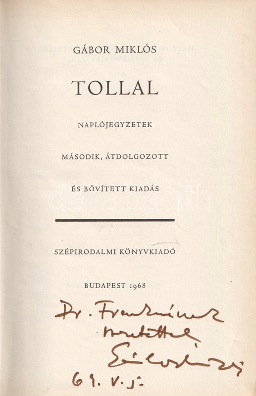 Dedikált: "Dr. Franknénak szeretettel: Gábor Miklós. 64. V. 5."