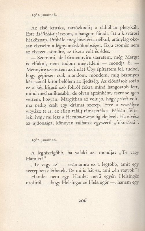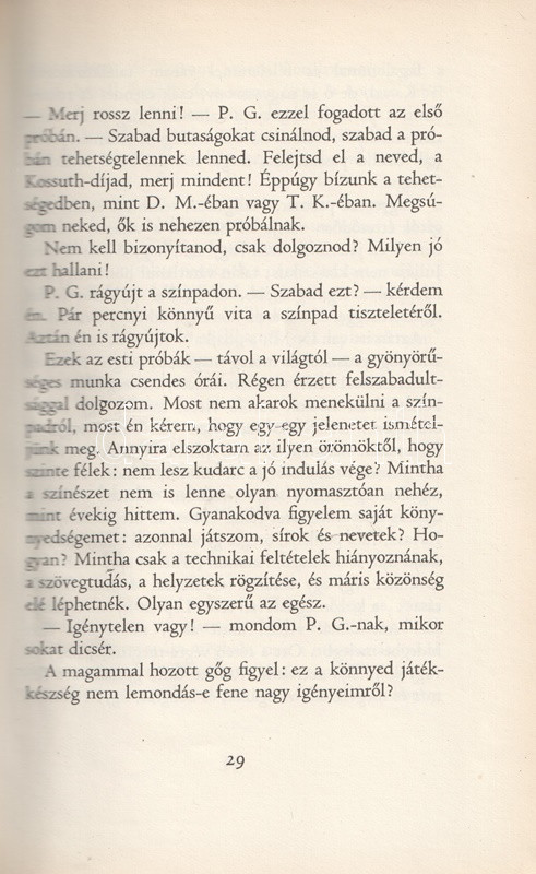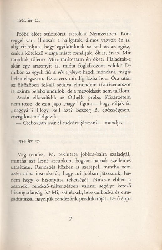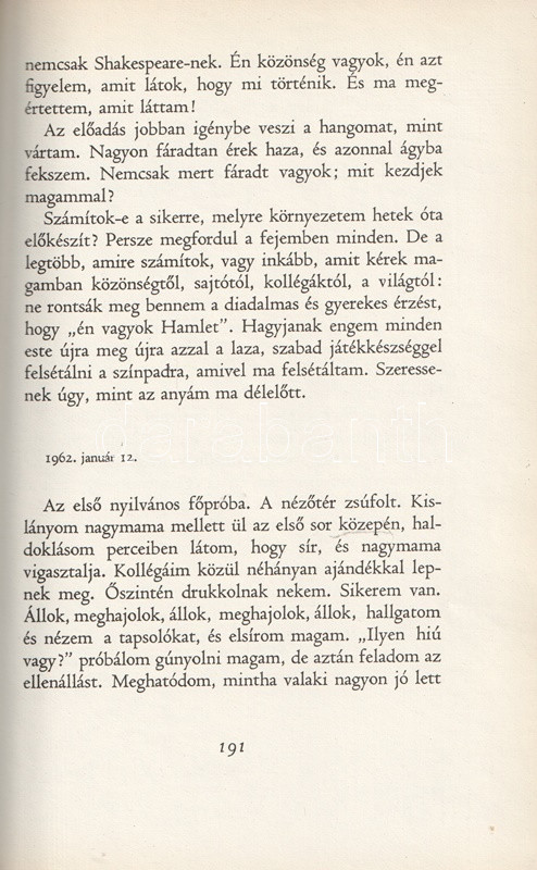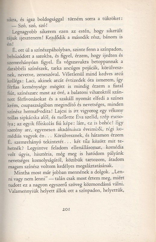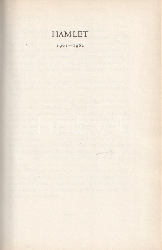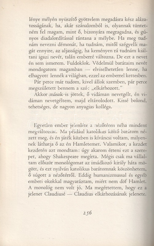 Gábor Miklós (1919-1998) Kossuth-díjas színművész, érdemes és kiváló művész kötete eljátszott szerepei kapcsán a művész belvilágának töprengéseibe vezet be. A munka első kiadása 1963-ban jelent meg, példányunk a második, kibővített kiadásból származik. Az új kiadás megjelentetésére az első kiadás nyomdába adása után elnyert, igen erős szakmai kihívást nyújtó és hosszas elmélkedésekre sarkalló Hamlet-szerepe adott okot. Oldalszámozáson belül 24 egész oldalas felvétellel.