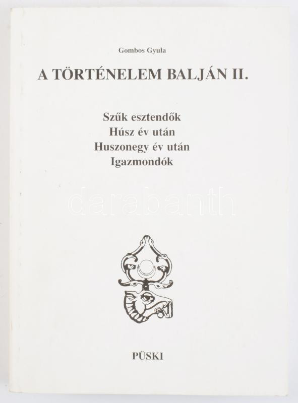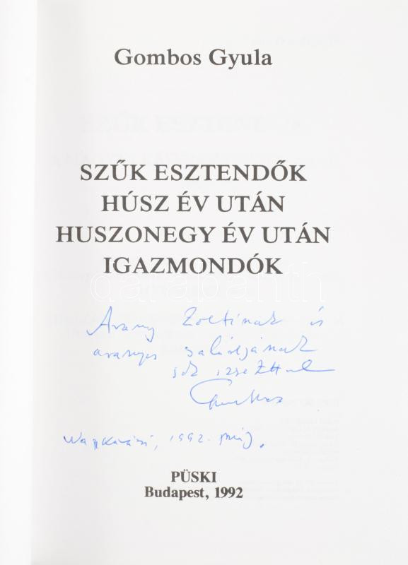 Gombos Gyula: A történelem balján II. Szűk esztendők. Húsz év után. Huszonegy év után. Igazmondók. A szerző, Gombos Gyula (1913-2000) Széchenyi-díjas emigráns irodalomtörténész, újságíró, író, esszéíró által DEDIKÁLT példány. Bp., 1992, Püski. Kiadói papírkötés, a hátsó borító alsó sarkán hajtásnyommal.