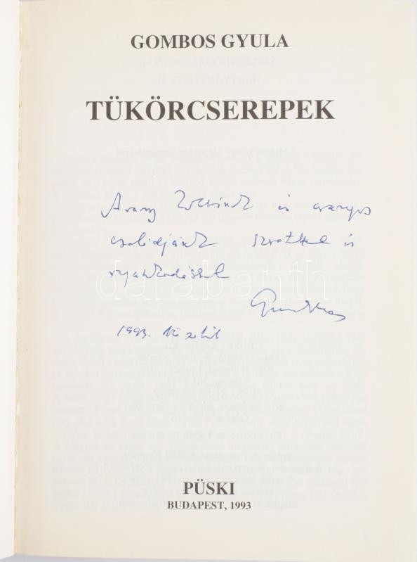Gombos Gyula: Tükörcserepek. A szerző, Gombos Gyula (1913-2000) Széchenyi-díjas emigráns irodalomtörténész, újságíró, író, esszéíró által DEDIKÁLT példány. Bp., 1993, Püski. Kiadói papírkötés.