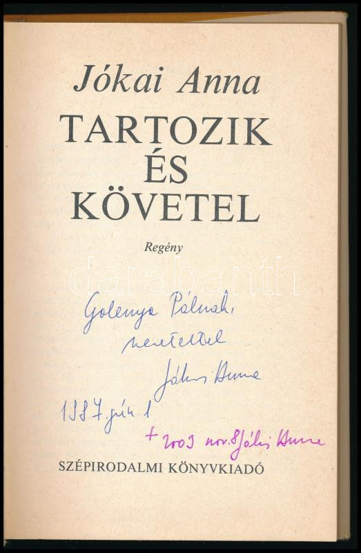 Jókai Anna: Tartozik és követel. DEDIKÁLT! 1984, Szépirodalmi. Kiadói egészvászon kötés, papír védőborítóval, jó állapotban.