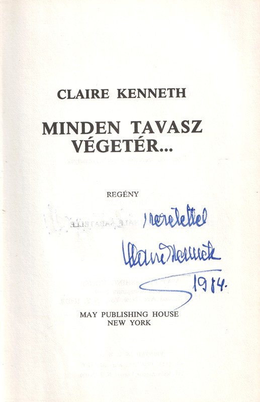 Dedikált: "Szeretettel Claire Kenneth. 1984." A címlapon a dedikálás címzettje nem olvasható.