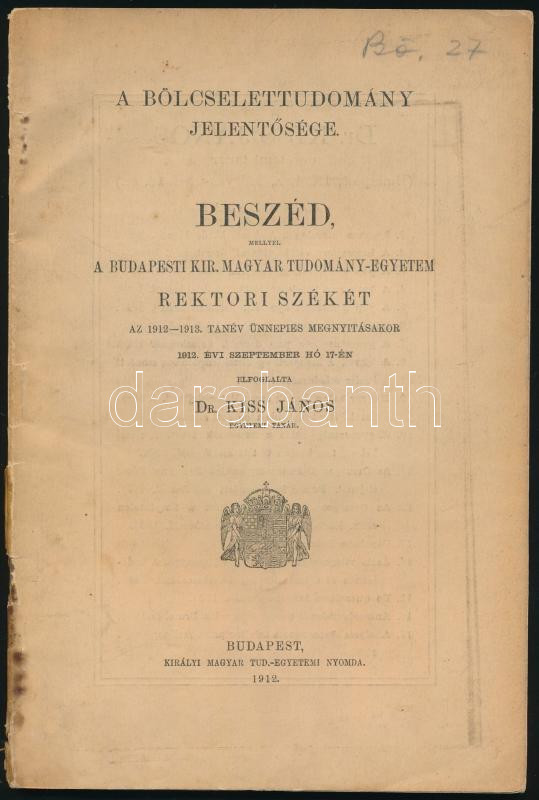 Kis János: A bölcselettudomány jelentősége. Beszéd, mellyel a Budapesti Kir. Magyar Tudomány-Egyetem rektori székét az 1912-1913. tanév ünnepies megnyitásakor 1912. évi szeptember hó 17-én elfoglalta - - . Bp., 1912, Kir. M. Egyetemi Ny., 40 p. Kiadói papírkötés, kissé foltos, sérült borítóval, néhány kissé foltos lappal, tulajdonosi névbejegyzéssel, ceruzás bejegyzésekkel.