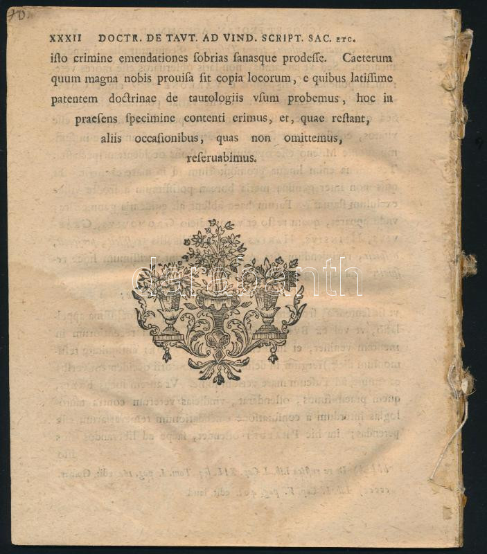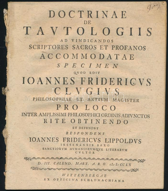 Kluge, Johann Friedrich - Lippold, Johann Friedrich: Doctrinae de tautologiis ad vindicandos scriptores sacros et profanos accomodatae specimen [...] Wittenberg, 1760, Schlomachius, [8]+XXXII p. Latin nyelven. Fűzve, borító nélkül, az utolsó lapon folttal.