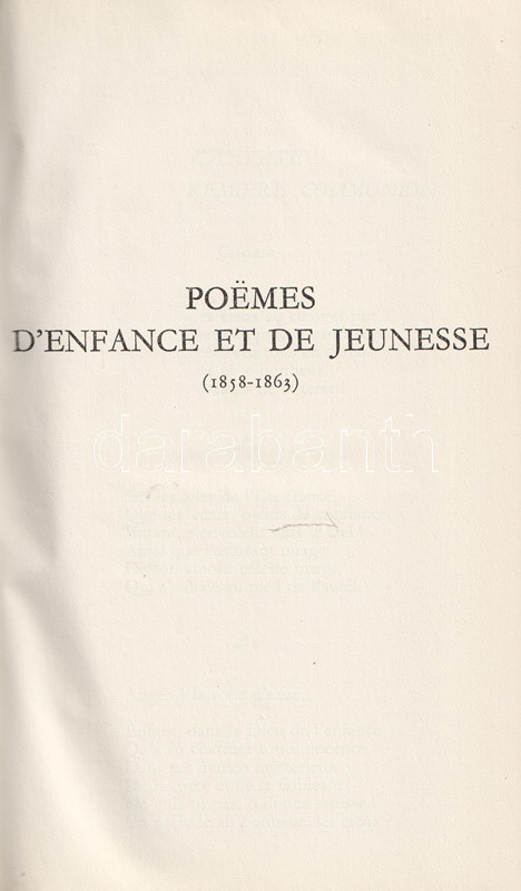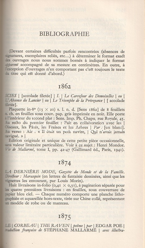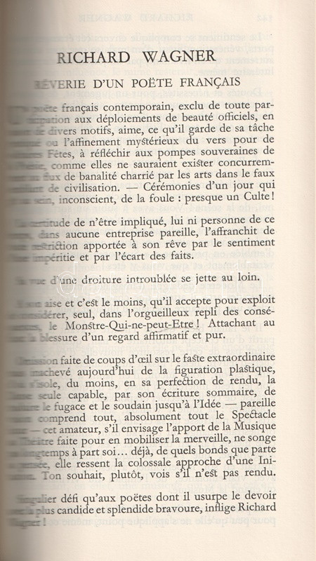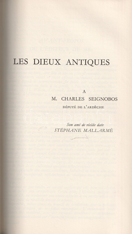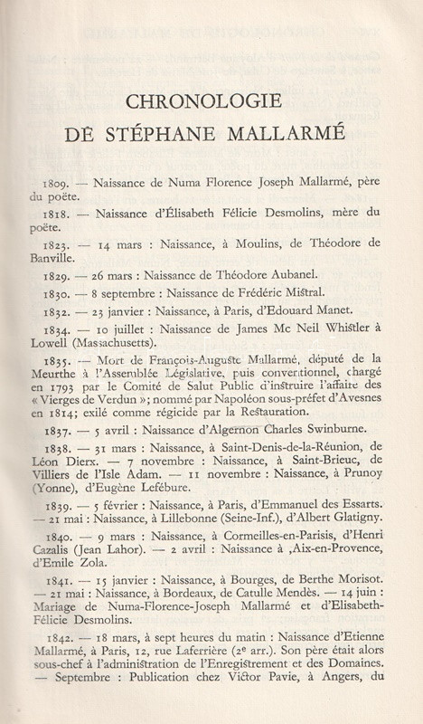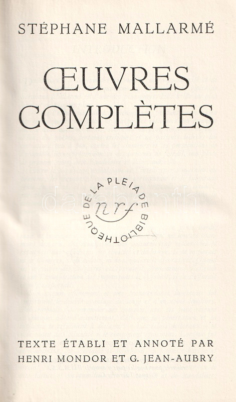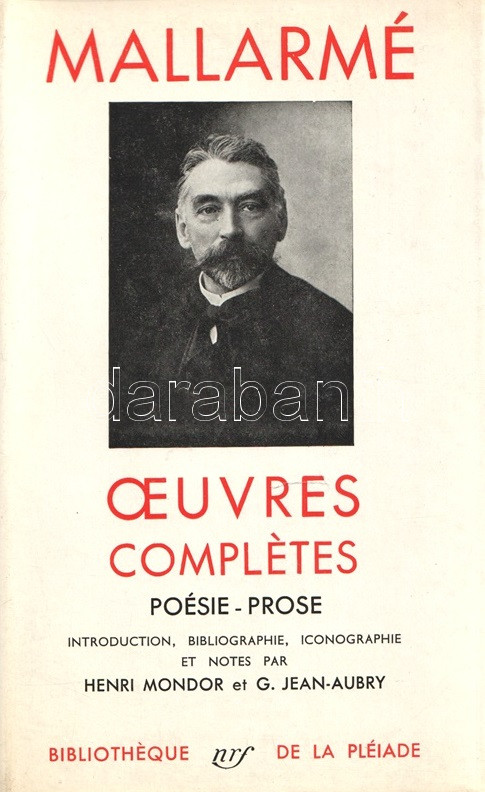 Stéphane Mallarmé (1842-1898) nehezen megközelíthető, talányos, homályos értelmű szimbolista költeményeiről, hűséges tanítványi köréről nevezetes francia költő, esszéíró, műfordító. Lírai, prózai, értekező és műfordítói életműve a nemzeti klasszikusok bibliofil, jegyzetelt, kritikai sorozatában, a "Bibliotheque de la Pléiade" sorozatban 1945 óta szerepel. Példányunk a Pléiade-sorozat Mallarmé-kötének 1956. évi változatlan újra nyomásából származik.