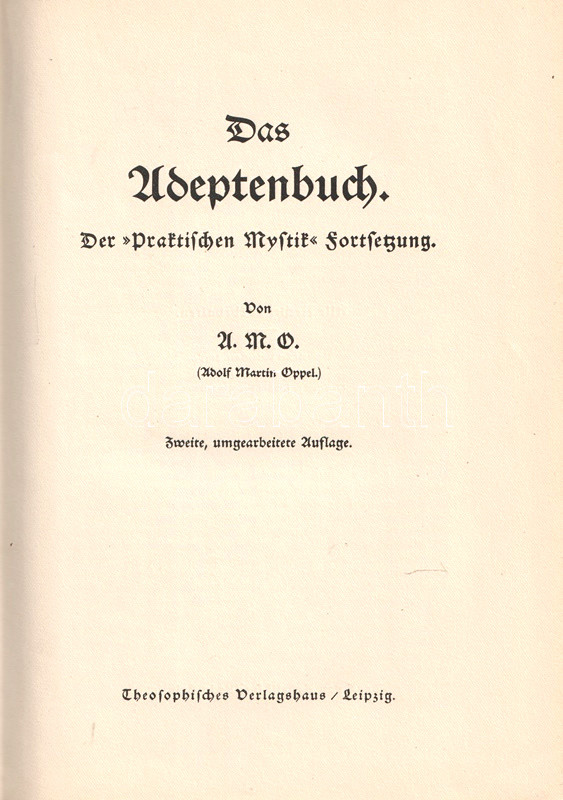 Adolf Martin Oppel (1840-1923) német teozófus ezoterikus értekezése először 1906-ban jelent meg. Példányunk a második kiadásból való.