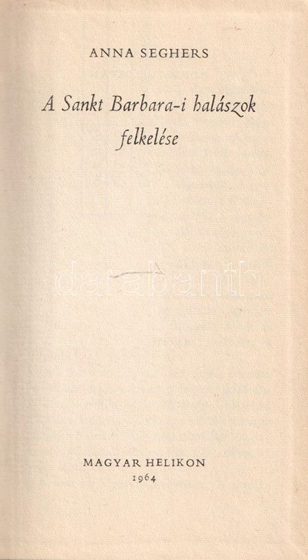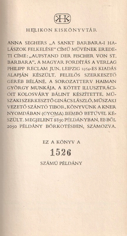 Kolofon: "Anna Seghers "A Sankt Barbara-i halászok felkelése" című művének eredeti címe "Aufstand der Fischer von St. Barbara" (1928). A magyar fordítás a Verlag Philipp Reclam (Leipzig) 1954-es kiadás alapján készült. Felelős szerkesztő Geréb Béláné. A sorozatterv Haiman György munkája. A kötet illusztrációit Kolosváry Bálint készítette. Műszaki vezető Szántó Tibor. Könyvünk a Kner nyomdában Bembó betűvel készült, megjelent 8850 példányban, ebből 2050 példány bőrkötésben, számozva. Ez a könyv az 1526. számú példány".